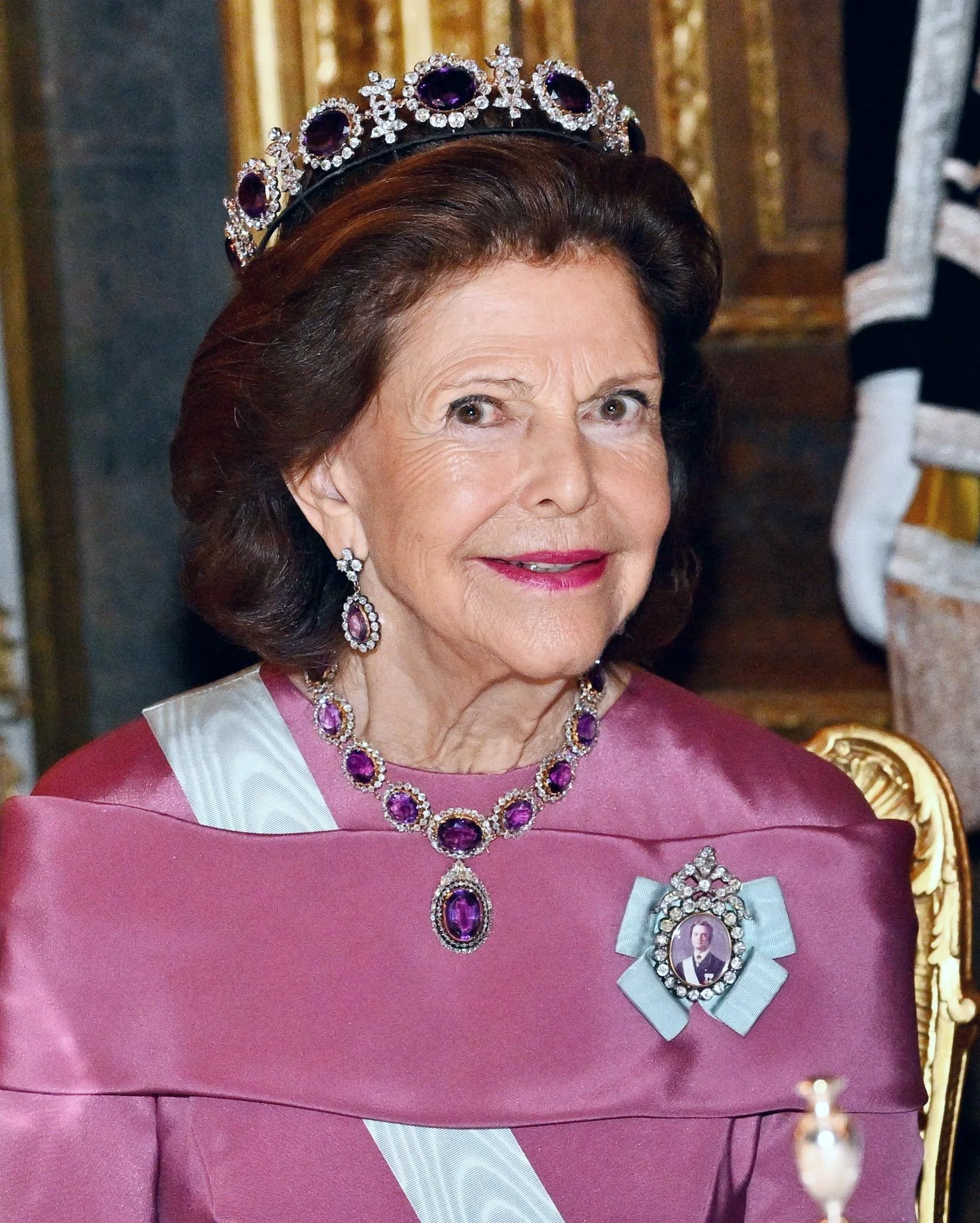 I would be thrilled to see Queen Silvia wearing Queen Victoria of Sweden's pearl and diamond corsage brooch, as it has been very rarely seen (there are only a few pictures of Queen Victoria wearing it, and Queen Silvia has worn it only once, on 6th October 2016, for a State dinner at Charlottenburg Palace in Berlin - and no other Queen or Princess inbetween).